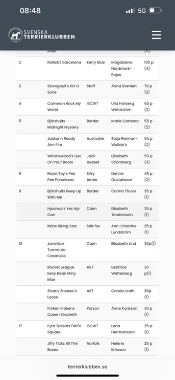 Tittar på års listorna på Terrier klubben och ser att lilla Elisabeth även i år är med på en stolt placering som 12:a
